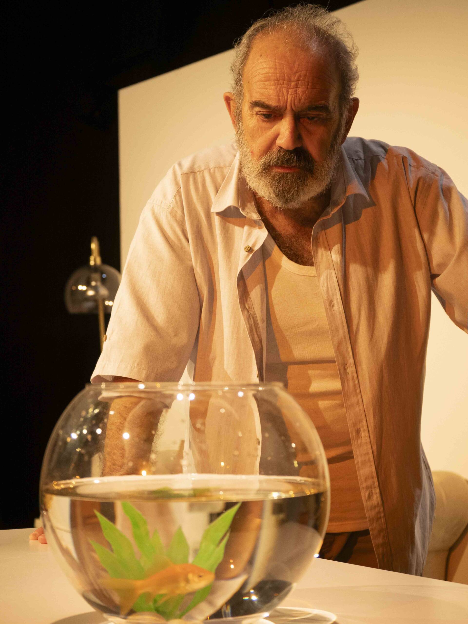 Σε αυτό το οδοιπορικό του — μέσα σε ένα δωμάτιο — ο «απείθαρχος» παππούς μιλά στο σιωπηλό, χρυσό κάτοικο μιας γυάλας.