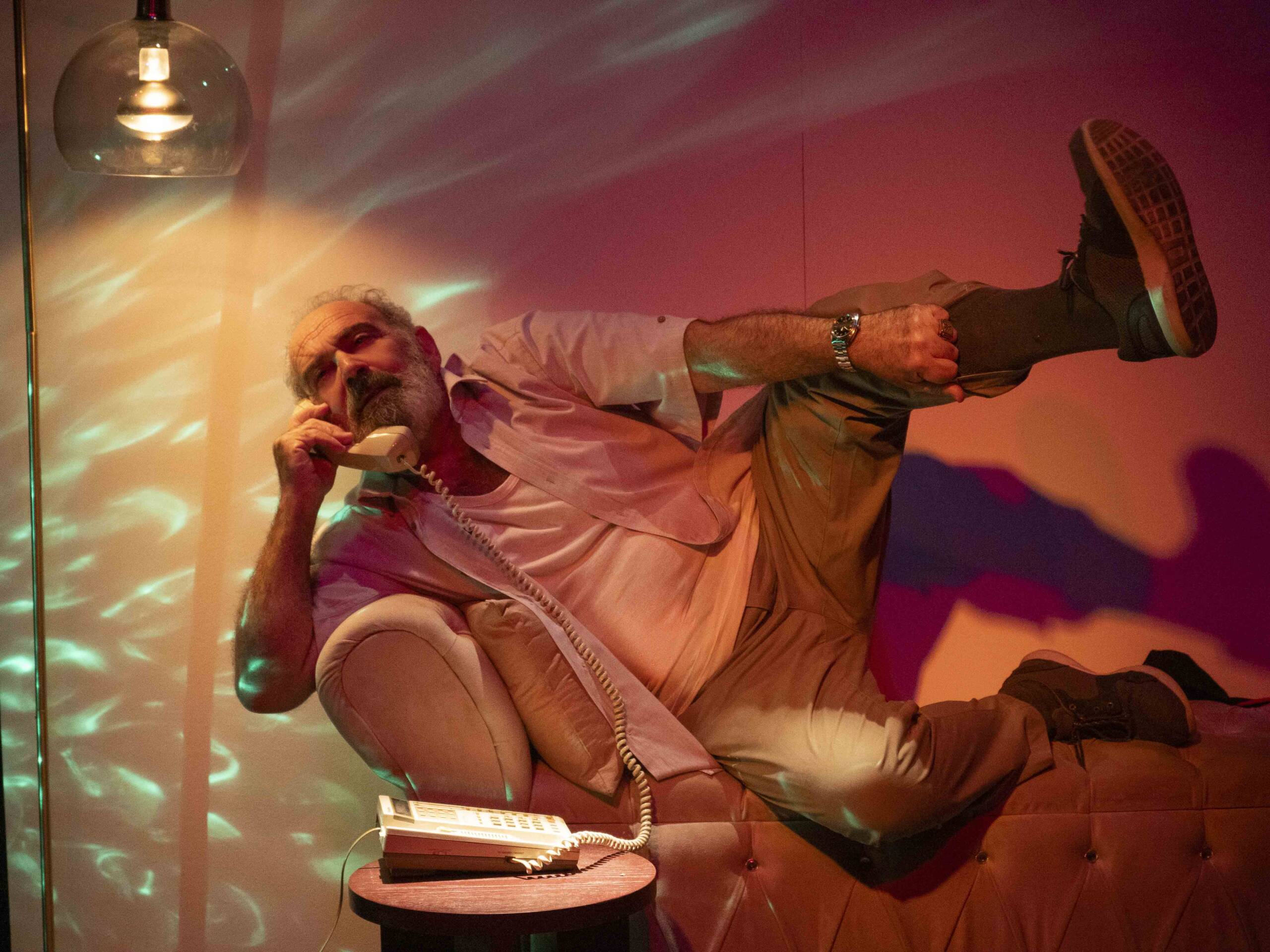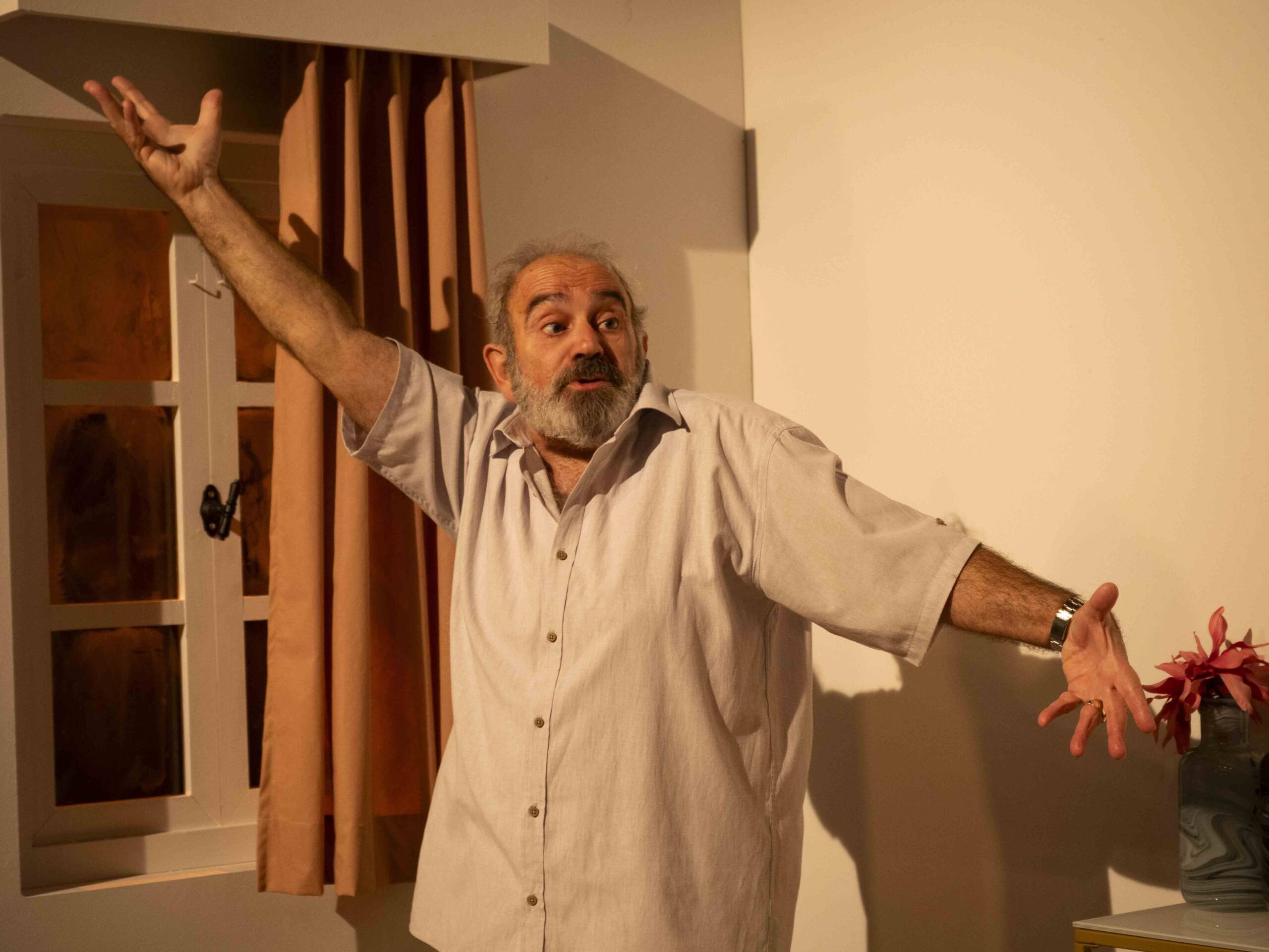 Στο άδειο σπίτι, μόνος του, χλευάζει τους πάντες και τα πάντα και πάνω απ’ όλα τον ίδιο του τον εαυτό. Ένα πρόσωπο με έντονο το στοιχείο του τραγικού και του κωμικού μαζί, που εναλλάσσονται διαρκώς μέχρι την τελική, τρυφερή τους ένωση…